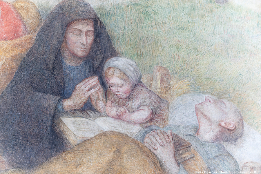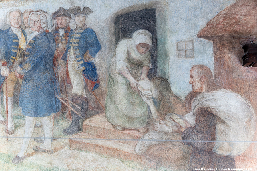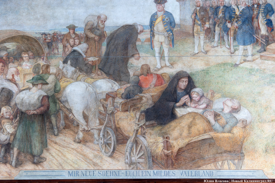 Внизу фрески имеется надпись: «Мне новые сыновья — вам милосердная родина». Эти слова приписывают королю Фридриху Вильгельму I. История с массовым переселением жителей в Гумбиннен (будущий Гусев) повторится уже в августе 1946 года, когда из Брянской области на здешний вокзал прибудет первый эшелон с советскими переселенцами.