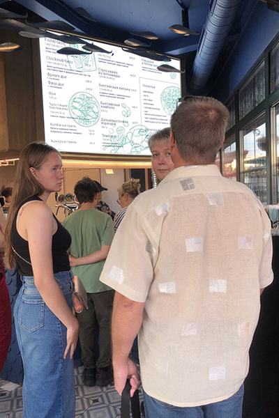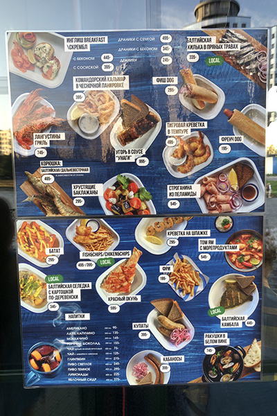 Заведение специализируется на рыбных, в том числе локальных блюдах. К примеру, за 345 рублей можно попробовать балтийскую селёдку с картошкой по-деревенски, за 445 — балтийскую камбалу, за 335 — балтийскую кильку в пряных травах. Фиш-дог обойдётся в 295 рублей.