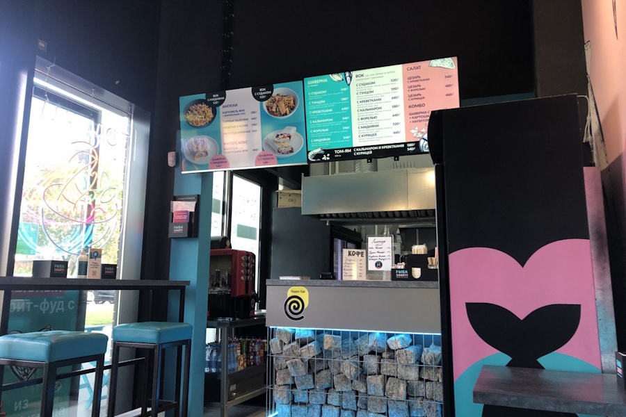 Также в кафе готовят вок с теми же наполнителями (от 440 рублей), салат цезарь с креветками, форелью или курицей (от 460), том-ям (от 540), классические фастфуд-закуски и авторские лимонады.