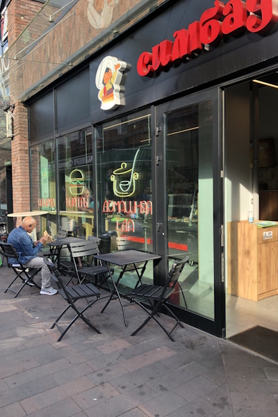 Также в меню супы, сэндвичи, самса, лагман, хот-доги, панини, люля-кебаб, гамбургеры и различные напитки. Кафе открыто ежедневно с 10 до 21 часа. Доступны заказы навынос.