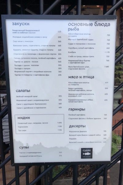 Ресторан «Судак» рассчитан на 40 посадочных мест. Заведение специализируется на европейской кухне. Здесь предлагают большое разнообразие интересных закусок. К примеру, молодые сицилийские оливки к вину можно заказать за 295 рублей, фирменный паштет с вишнёвым компоте (десерт, представляет собой фрукты в сиропе, но может и быть частью муссовой начинки в торте — прим. «Нового Калининграда») — за 365, тостадо с диким лососем — за 595. Не обошлось и без традиционных строганины из пеламиды (595 рублей) и кёнигсбергских клопсов из говядины или судака (от 625 рублей). Карамелизированные рёбра с мятым картофелем обойдутся в 695 рублей, порция камбалы — в 1195, филе балтийского угря со стручковой фасолью — в 1485. Также в меню есть десерты. Например, баскский чизкейк с вишнёвым компоте стоит 425 рублей.