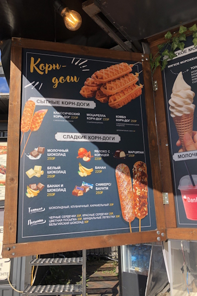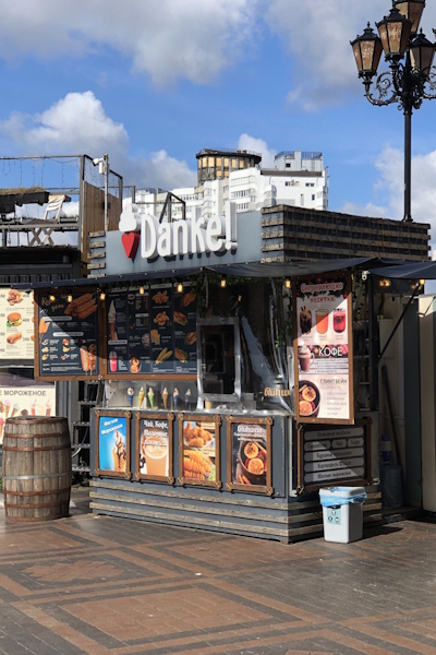 Кафе быстрого питания Danke — это уличный фургончик со столиками на улице. Здесь готовят сытные и сладкие корн-доги. За 220 рублей можно попробовать классический вариант с молочной сосиской или с сыром моцарелла, за 250 — корн-доги с молочным или белым шоколадом, а также бананом. За дополнительные 20 — 30 рублей вам добавят шоколадный, клубничный или карамельный топинг, а также посыпку в виде сердечек или миндальных лепестков. 190 г мягкого мороженого будут стоить вам 200 рублей. Также в меню различные блюда с немецкими колбасками (от 340 рублей), куриные крылышки (от 210), наггетсы (от 160), картофель фри (от 200) и твист (150). Напитки прилагаются. Кафе открыто ежедневно с 10 до 21 часа.