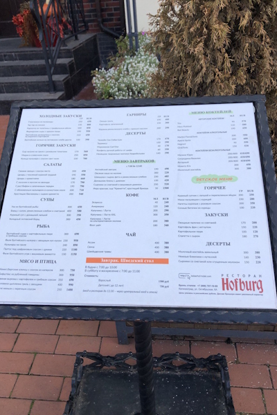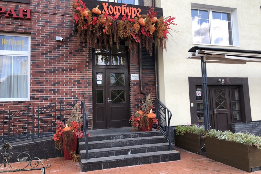 Ресторан Hofburg вмещает до 100 человек. Заведение специализируется на европейской кухне. С 7 часов утра здесь доступен завтрак в формате шведского стола стоимостью 750 рублей для ребёнка, 1500 — для взрослого. В меню холодные и горячие закуски, супы, салаты, рыбные блюда и десерты. Порция вездесущей строганины из пеламиды обойдётся в 650 рублей, фермерские сыры с орехом пекан — в 950, филе балтийского угря с вишнёвым винкотто — в 1150. Любители сладкого смогут попробовать немецкие творожные пончики Кваркбельхен за 390 рублей или конфеты ручной работы от шефа — за 350.