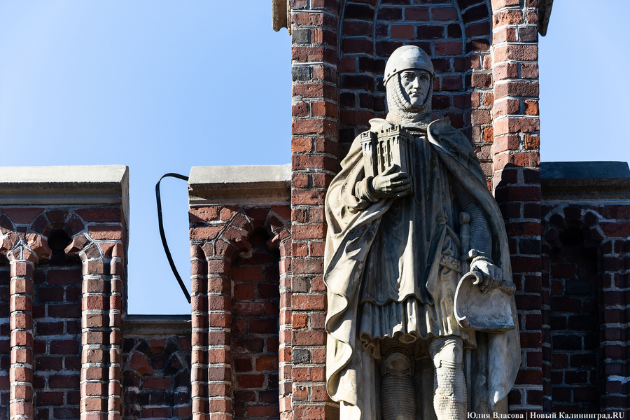 Со стороны проспекта Калинина на нас смотрит мужчина с флагом. Это Фридрих фон Цоллерн — знаменосец орденских войск во время Грюнвальдской битвы в 1410 году, комтур крепости Бальга.