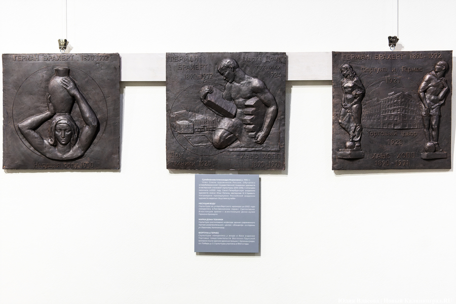 Ряд работ напоминает о городских скульптурах Брахерта — сохранившихся, как, например, встроенный в стену бывшего Дома техники (сегодня ТЦ «Эпицентр» в Калининграде) «Каменотес», или «Несущая воду», что стояла в Лиственничном парке Светлогорска (сейчас там — копия, оригинал — в Доме-музее Брахерта), так и пропавших — вроде фигур Фортуны и Гермеса, украшавших здание Торгового двора (ныне — администрация Калининграда), композиции «Хронос на трех лошадях», которая некогда размещалась над центральным входом Главного вокзала Кенигсберга. В наше время вокзал называется «Южный», а на месте «Хроноса» — герб РСФСР.