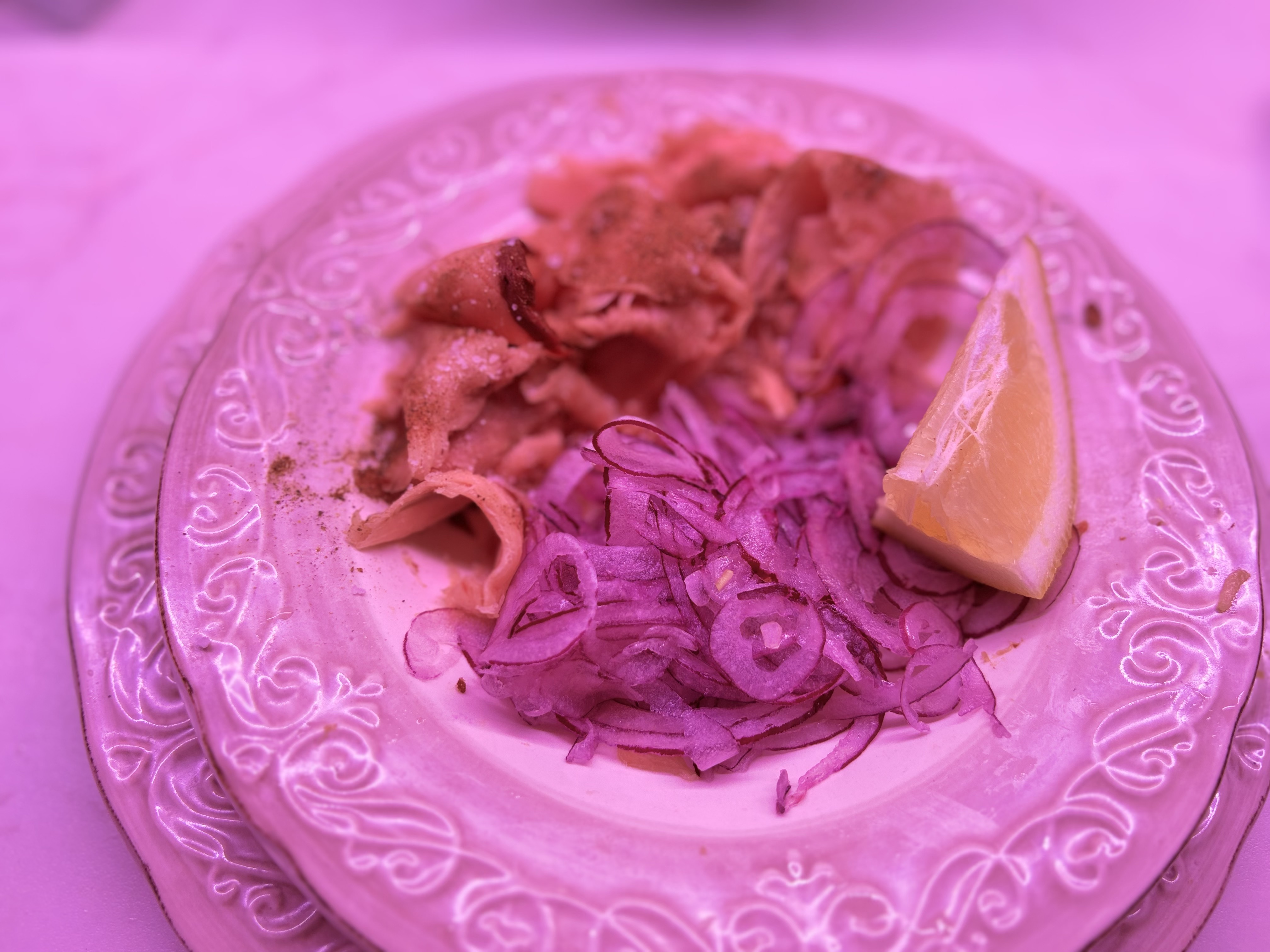 Кто-то нарезает пирамиду кубиками со сторонами 5-10 мм. Тоже вариант. Здесь все зависит от вашего вкуса. Затем тоненько шинкуем репчатый лук. Мы взяли красный, но это больше для цветового разнообразия в тарелке, нежели для вкуса. Все вместе складываем в емкость и посыпаем солью, черным молотым перцем, поливаем подсолнечным маслом, лимонным соком и перемешиваем. В принципе, есть строганину можно сразу. Мы предпочитаем намазывать образовавшуюся массу на подогретый черный хлеб.