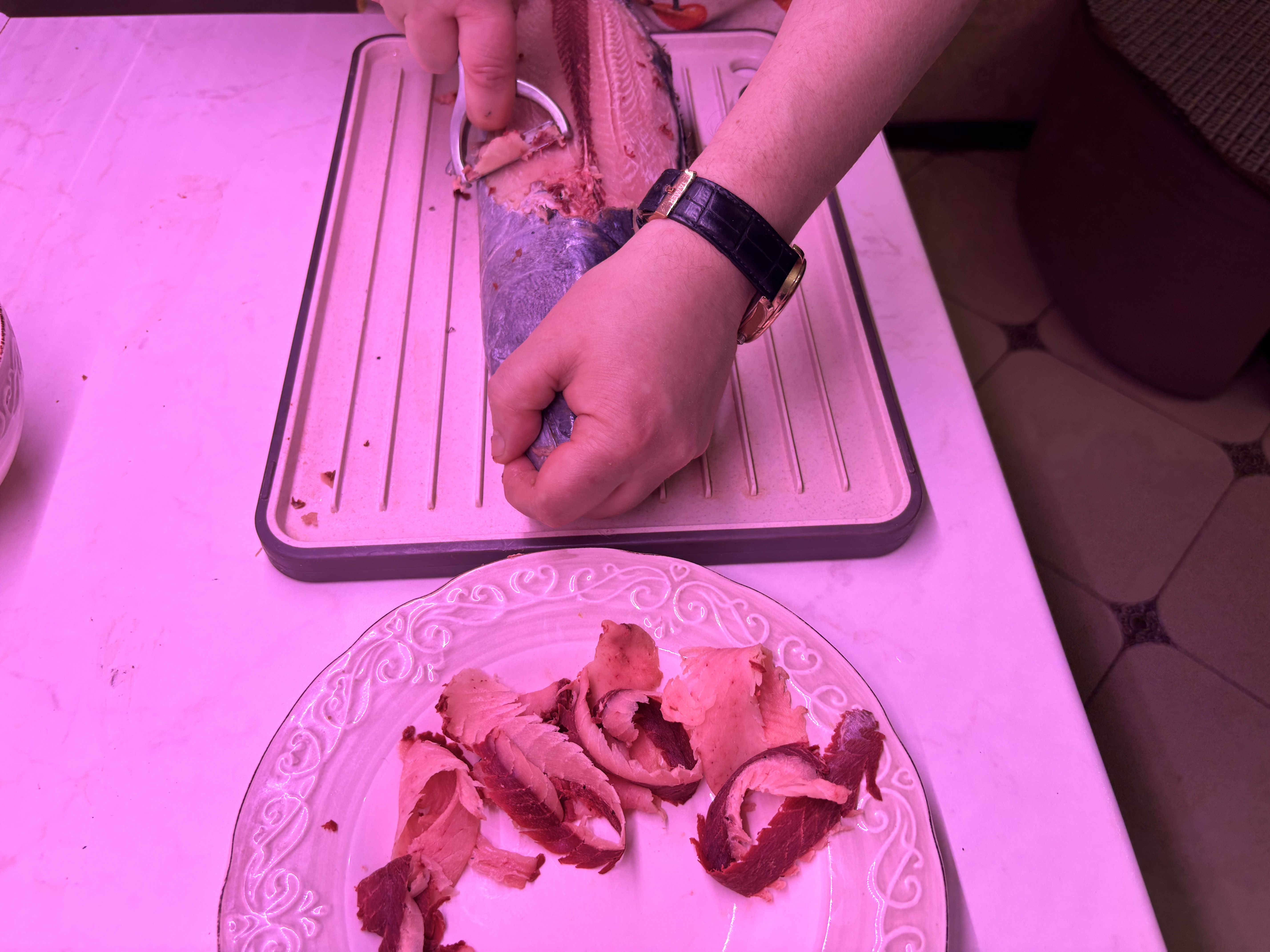 Наша купленная на рынке пеламида потянула на 1,6 кг. Выход чистого мяса составил около 700 граммов. Сначала нужно снять с сильно замороженной рыбы кожу. Сделать это можно при помощи надежной металлической овощечистки, хлипкая пластмассовая вряд ли будет полезна. Дальше с помощью того же приспособления нарезаем тонкие лепестки рыбы. Можно, конечно, использовать и острый нож, но нужно соблюдать осторожность, чтобы не порезаться. Если видите, что рыба подтаивает, лучше положить её на некоторые время в заморозку, а потом продолжить процесс.