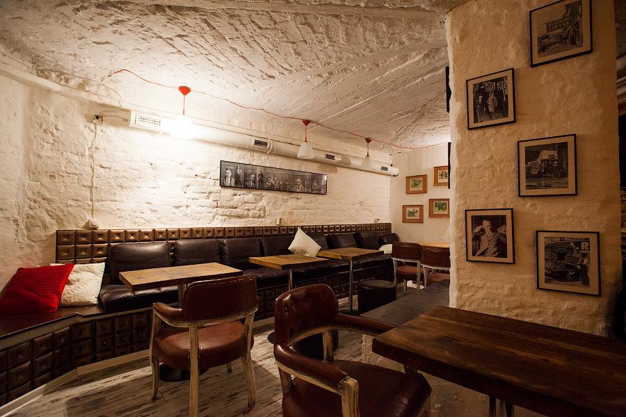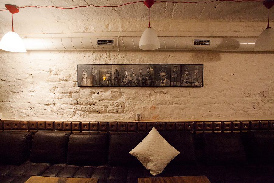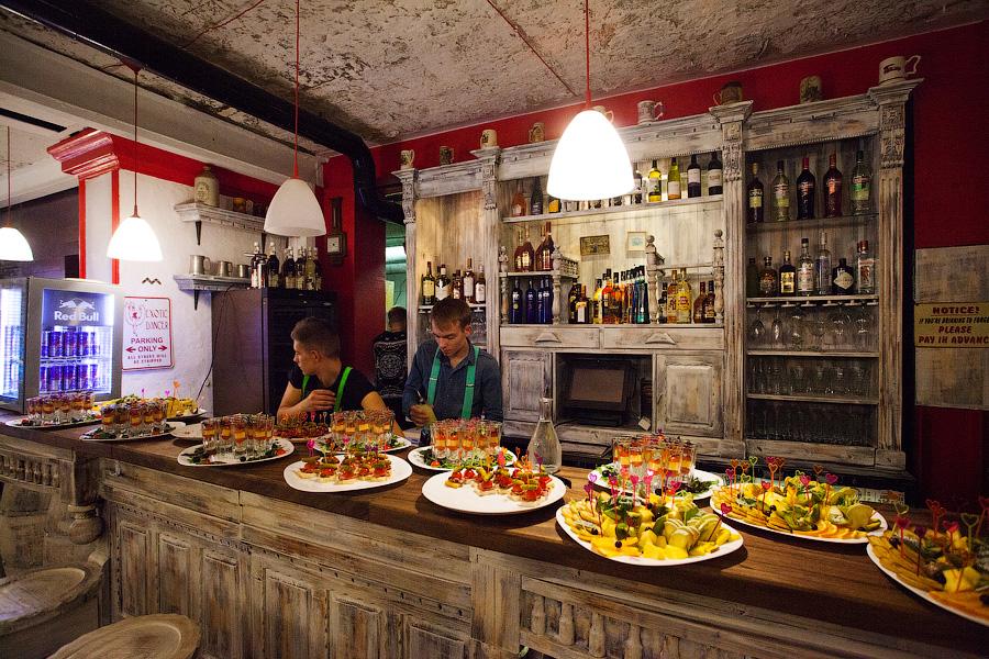 За соседним столом тараканов нет, но отчего-то белой пылью покрыты темные кожаные сидения. Садимся. Спустя десять минут официант приносит нам напиток от заведения — шампанское, разлитое по бокалам для мартини. В основном зале на барной стойке фуршетные закуски, состоящие из примитивных канапе, а также роллов из лаваша. Внутри роллов — вареная колбаса вперемешку с салатом, заправленным сметаной. На часах восемь вечера, мы просим основное меню и карту бара. Официант говорит, что может только показать основное меню, но кухня начнет работать в одиннадцать вечера. В меню значатся практически все блюда из «Speakeasy», в том числе и «тушенные в соевом соусе куриные лапы (время приготовления 50 минут)» за 230 рублей, различные морепродукты, и, из замечательного, «ризотто из перловки с белыми грибами и спаржей» за 330 рублей. К ряду блюд идет бесплатный гарнир. Входят ли в гарнир бесплатные тараканы — не уточняется.