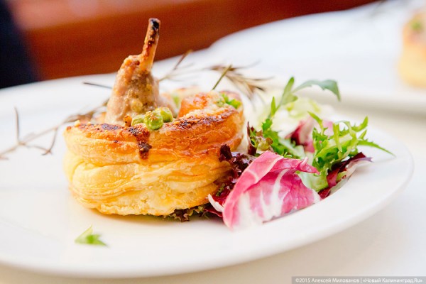 Перепелку мы готовим по такому же принципу, как и готовили кролика. Только после того, как достали ее из вакуумного пакета, еще и обжариваем на смеси оливкового и растительного масла до золотистого цвета. Выкладываем на блюдо к салатной смеси, к ней можно добавить и редис, и моченую антоновку. Заправляем оливковым маслом. В этот салат мне бы хотелось внести такие природные мотивы, поэтому я подаю его с облепиховым муссом. Облепиху, как и сосновые шишки, я собираю на нашей Балтийской косе. В этом опять же нет ничего сложного: промываем облепиху, измельчаем, вливаем в измельченные ягоды воду и протираем получившееся пюре через сито. Тот облепиховый жмых, который остался в сите, мы выкладываем в кастрюлю, заливаем оставшейся водой и ставим на огонь. Доводим до кипения, процеживаем, добавляем немного сахара и примерно 30 г желатина, который мы предварительно замочили в холодной воде. Возвращаем массу с желатином на огонь, и, помешивая, доводим до кипения. Остужаем, смешиваем с облепиховым пюре, которое мы ранее протерли через сито. Получившуюся массу взбиваем до пышности, раскладываем в формочки и несколько часов остужаем в холодильнике. В конечном итоге у нас получается субстанция наподобие мармелада, которую мы и выкладываем на тарелку к нашему салату из перепелок.