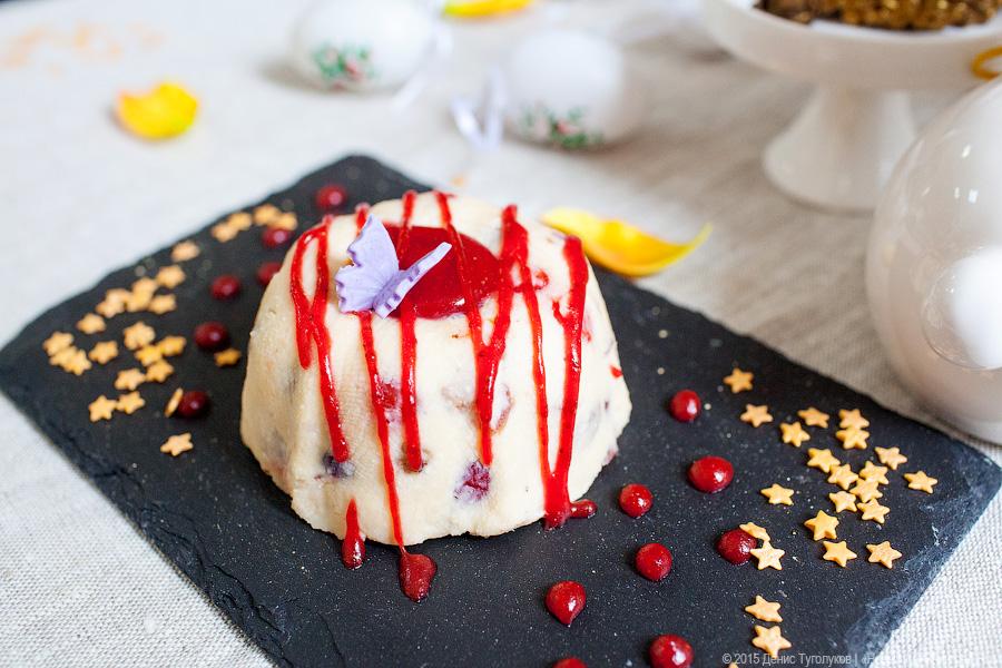 — Творог, масло, сметану и яйца растираем в указанной последовательности, постоянно помешивая, сварить. В подготовленную массу ввести остальные компоненты, остудить и поместить под пресс на сутки.