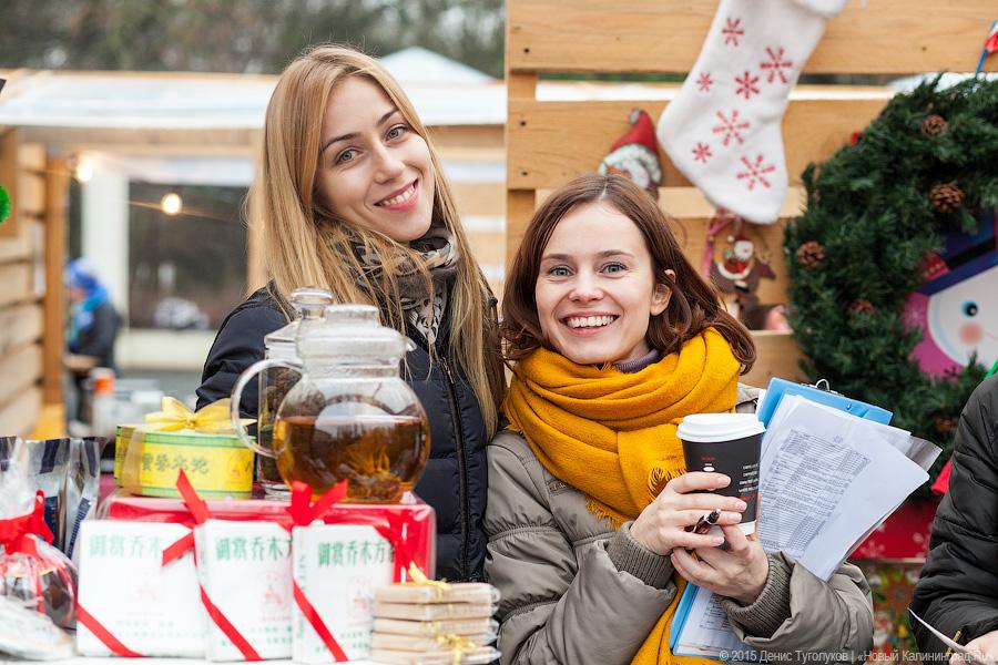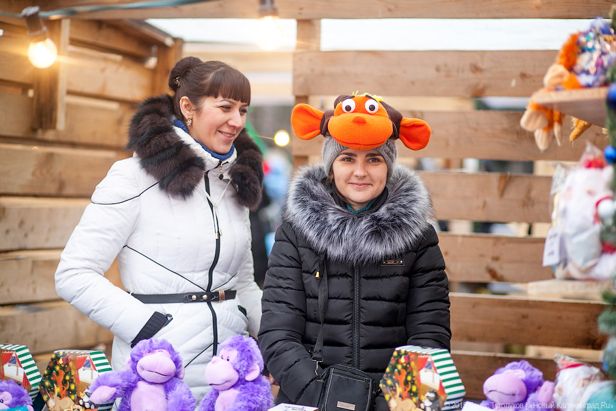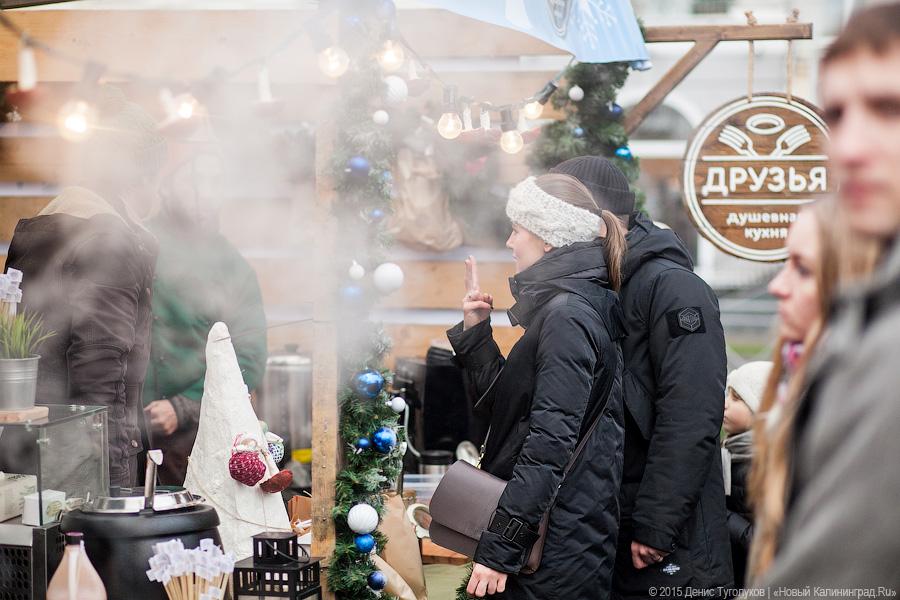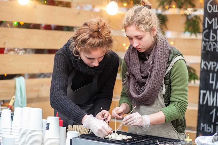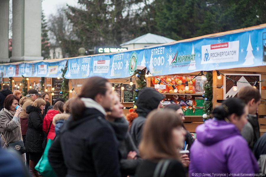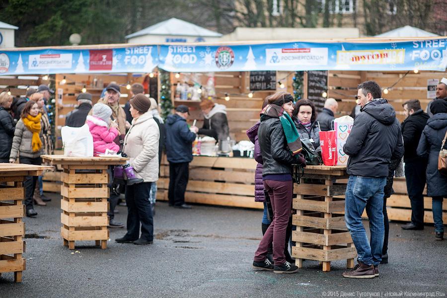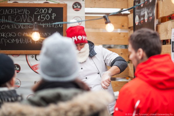 Рождественскую ярмарку около стадиона «Балтика» организовала команда «Kaliningrad Street Food Festival». Прошлогоднюю рождественскую ярмарку эта же команда организовывала в сквере у Музыкального театра (бывшего ДКР): тогда погода была более зимней — мелкий снежок и крепкий морозец, и, как сейчас кажется, тогда же было отчасти лучше организовано пространство. В сквере около ДКР в прошлом году была замечательная детская зона, где работали аниматоры, где дети могли построить что угодно из разных деревянных