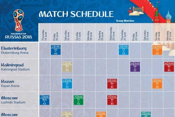 Международная федерация футбола опубликовала на своем официальном сайте расписание матчей Чемпионата мира по футболу 2018 года с указанием времени начала матчей, сообщает АНО «Дирекция Калининград 2018».