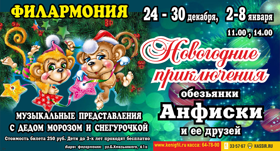 Мамы и папы, бабушки и дедушки, приходите с детьми на ёлку в филармонию! Помогите обезьянке Анфиске, Игране и Игруне справиться с трудностями, собрать листки Календаря и встретить Новый год как полагается — всем вместе, весело и радостно!
