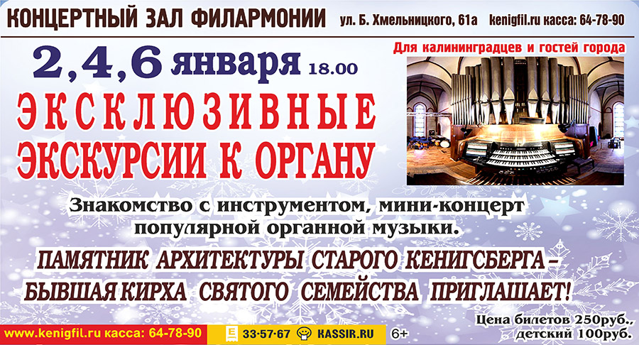А 2, 4 и 6 января в 18.00 Калининградская филармония дарит горожанам и гостям города еще один уникальный подарок — эксклюзивные музыкальные экскурсии к органу.