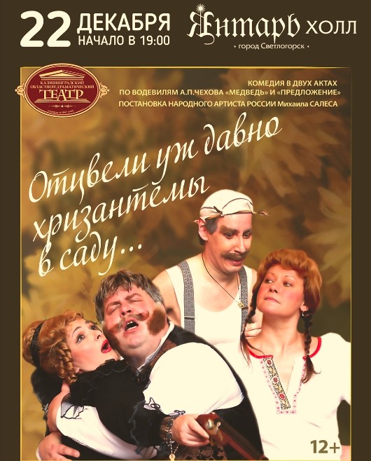 Калининградский областной драматический театр в гостях у Театра эстрады «Янтарь-Холл» 22 декабря в 19:00 подарит зрителям вечер русского водевиля - комедию «Отцвели уж давно хризантемы в саду…». В спектакле объединены два водевиля Антона Чехова — «Медведь» и «Предложение», поставленные в стилистике русского провинциального театра.