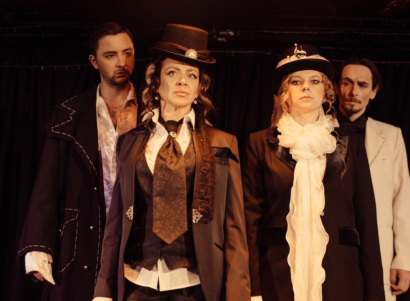 Персонаж-режиссёр присутствует почти во всех ценах спектакля, оставляя за собой право на вмешательство в любой момент. Метапластика в черных занавесах и масках под магическую музыку. Истинные лица прикрыты масками масонства. Великолепный образ князя Мышкина, ставшего причиной соперничества двух женщин.