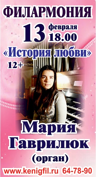 В канун праздника, 13 февраля, чудесным подарком станет органная «История любви». Под сводами старинного зала в исполнении молодой органистки Марии Гаврилюк зазвучат прелестнейшие произведения композиторов-романтиков: вариации на тему старинной английской песни «Леди Зелёные рукава», «Чакона фа минор» И. Пахельбеля, «Соната ля мажор» Ф. Мендельсона, «Прелюдия», фуга и вариация С. Франка, «Фантазия N 3» К. Сен-Санса, «Молитва» Л. Боэльмана. Кстати, каждая из этих мелодий связана с конкретной историей любви. Так, авторство песни «Леди Зелёные рукава» приписывают королю Генриху VIII, посвятившему ее своей тайной возлюбленной. Кроме этого, вы услышите переложение для органа в четыре руки известных песен из репертуара ансамблей Beatles, Abba, мелодий Э.Ллойда-Уэббера, которые Мария сыграет со своим отцом — органистом Владимиром Гаврилюком.