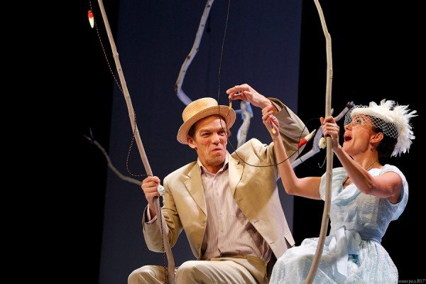 «Рыбалка с Чеховым» получилась милой, местами очень обаятельной, местами даже смешной полуторачасовой историей, которая наполненная разжеванным классическим текстом, необязательной бутафорией (ах, эти искусственные камыши, эти платьица, эти шляпки и бороды) и больше, к сожалению, ничем. Для кого едва ли не по слогам прочитаны эти четыре рассказа и, главное, зачем? Сам режиссер рассказал, что всего у Чехова около трехсот рассказов, все они заслуживают внимания, но не могут войти в один спектакль, поэтому появилась идея сделать цикл постановок, объединенных какой-то одной темой. Первой темой стала рыбалка. Дальше, следуя задумке Ляхова, таким же образом будут представлены серии об охоте и путешествиях с Чеховым. Наверняка еще можно будет сделать серии и о любви, и о, прости господи, социальном неравенстве, мещанстве, болезнях и врачах: корпус произведений классика позволяет состряпать тематические блоки. Какими они получатся — посмотрим. Первый получился для «младшего и среднего школьного возраста». Что довольно неплохо — можно ходить всем классом в Музыкальный театр вместо уроков литературы. И сочинения потом писать не нужно.