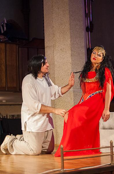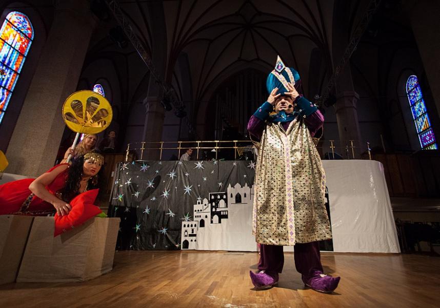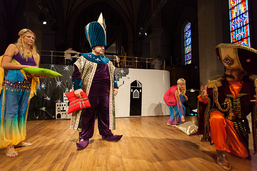 Задействованы в постановке сотрудники филармонии с большим стажем работы. Режиссер спектакля — Ирена Ларсен, исполнители — солисты и музыканты калининградской филармонии. Главные роли играют Александр Дудницкий (Аладдин) и Виктория Бобкова (принцесса Будур). Вместе с опытными артистами в спектакле принимает участие и юная артистка — девятилетняя Анна Гедрите исполняет роль восточной танцовщицы.