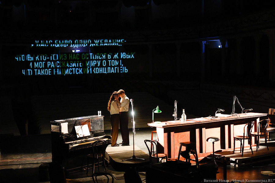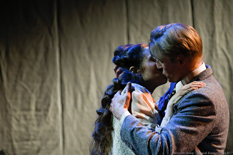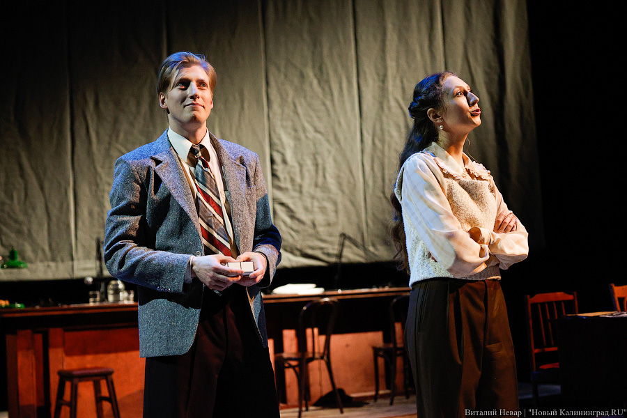 В основе спектакля — пьеса юриста и историка Александра Звягинцева, в своё время переквалифицировавшегося в писатели. По его роману «На веки вечные» в этом году должен выйти исторический блокбастер «Нюрнберг» (12+), где роль Дворца правосудия исполнила бывшая биржа Кёнигсберга. На сцене драмтеатра обратились к его «Нюрнбергскому вальсу» — истории любви советского разведчика Дениса Славина и переводчицы французской делегации, белоэмигрантки Ирины Гагариной. Оба русские, из одного поколения, но он — из красных, она — из белых, и, вероятно, их отцы могли стрелять друг в друга в Гражданскую войну. Анонс спектакля обещает показать крупным планом любовь, не допустимую по идеологическим причинам, но, к счастью, режиссёр Евгения Колесниченко оставляет все сантименты, достойные сериалов на телеканале «Россия 1», на задворках повествования.