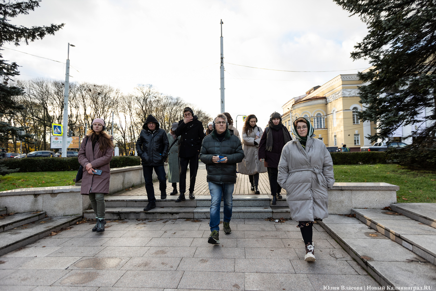Зрители идут от Научной библиотеки к площади Победы. В ушах звучит диалог о том, что в послевоенном Калининграде стоял неистребимый запах гари. В этот момент прямо перед носом проезжает автомобиль, обдавая улицу дымом. Всё, что попадает в поле зрения во время театрализованной прогулки, немедленно становится её частью. Дальше путь лежит к Северному вокзалу, безымянным дворикам у Паркового ручья, тихим улочкам за Драмтеатром, где еще не успели убрать брусчатку, неприкаянным руинам у зоопарка: «Архитектура — мать развалин». И на протяжении всего маршрута зрители будут пытаться увидеть Калининград таким, каким его мог увидеть Иосиф Бродский, если бы гулял здесь.