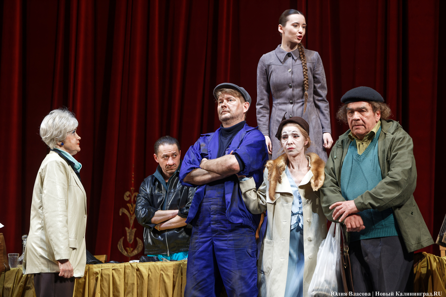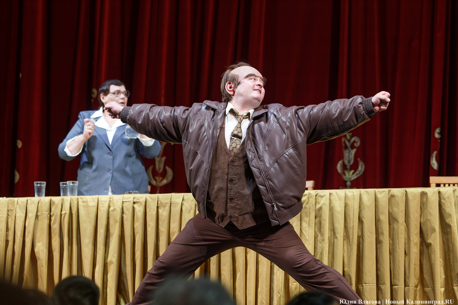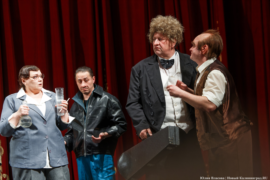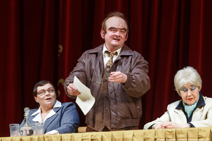 Представляется, что режиссер Евгений Маленчев хотел максимально вовлечь в происходящее зрителей. В первом акте не гас свет. На сцене — стол. За ним — члены правления кооператива. В первых рядах зрительного зала — пришедшие на собрание пайщики. Могло сложиться ощущение того, что ты сам присутствуешь на собрании. Но не сложилось... Немного мешало то обстоятельство, что персонажи слишком гротескны, слишком карикатурны, слишком похожи на клоунов. Нелепые парики, смешные накладные носы, килограммы напиханной в брюки ваты (или чего-то еще), чтобы фигура казалась похожей на грушу — всё это напоминало клоунаду и несколько снижало градус трагизма.