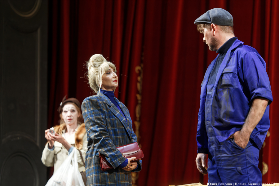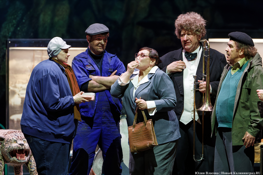 Возможно, поэтому спектакль режиссера Евгения Маленчева не особо связан со временем выхода фильма на экраны, то есть с концом 70-х — началом 80-х годов. В нем представлены типажи из разных эпох. Тут и функционер-словоблуд из 60-х вроде товарища Дынина из «Добро пожаловать, или Посторонним вход воспрещен» (6+) (Максим Пацерин), тут и браток из 90-х (Максим Махинов), тут и чем-то напоминающий молодого Воланда франт из 20-30-х (Дмитрий Хилько).