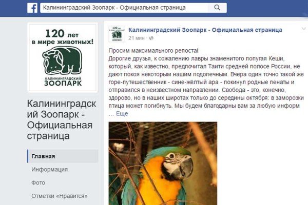 «Дорогие друзья, к сожалению, лавры знаменитого попугая Кеши, который, как известно, предпочитал Таити средней полосе России, не дают покоя некоторым нашим подопечным. Вчера один точно такой же горе-путешественник — сине-жёлтый ара — покинул родные пенаты и отправился в неизвестном направлении. Свобода — это, конечно, здорово, но в наших широтах только до середины октября: в заморозки птица может погибнуть. Мы будем благодарны вам за любую информацию о нашем „летуне“», — отмечается в сообщении.