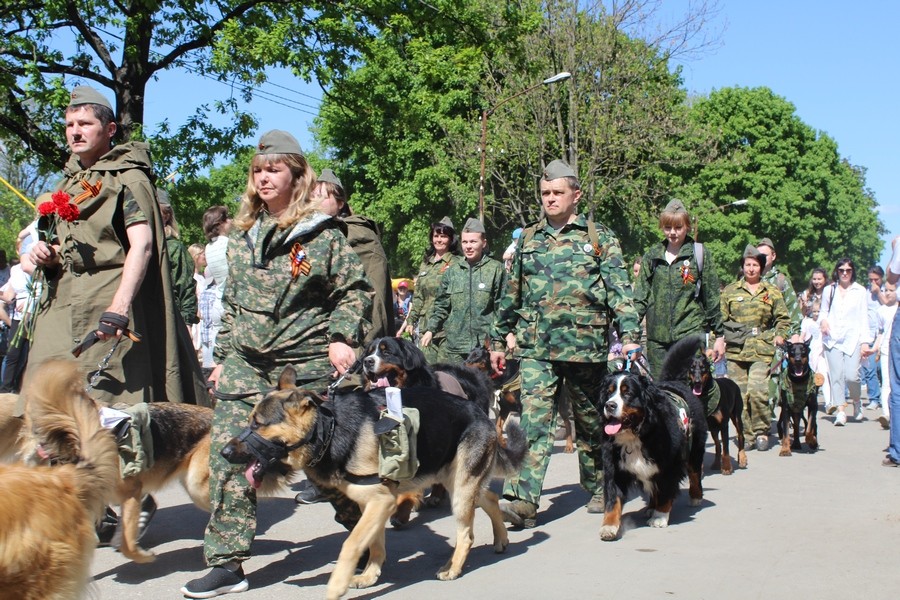 Вместе с хозяевами, одетыми в военную форму, в колонну выстроились 30 собак служебных пород, приравненных к служебным породам, а также крупные дворняги. На многих животных были элементы военной амуниции — специальные жилеты