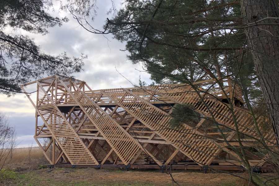 Конструкция обзорной площадки опирается на винтовые сваи, сама вышка собрана из соснового бруса различных оттенков. В дальнейшем конструкцию планируется украсить фигурами птиц из переработанного стекла, собранного на берегу Балтийского моря.