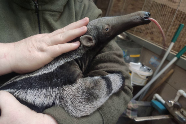 «Детёныш появился на свет 11 февраля у пары гигантских муравьедов — самки по кличке Кайя и самца по кличке Лектер (оба 2016 года рождения, Лектер прибыл из Чехии в 2017 году, Кайя приехала из Дании в 2018). Роды прошли под пристальным наблюдением зоотехнических специалистов и ветеринаров. Кайя самостоятельно кормит детёныша. Новорожденный еженедельно прибавляет в весе 200-300 граммов. Сейчас его вес — 2350 граммов. Первые месяцы жизни муравьеды проводят, крепко держась за мамину спину. Однако детеныш уже делает первые осторожные попытки передвигаться самостоятельно», — рассказали сотрудники.