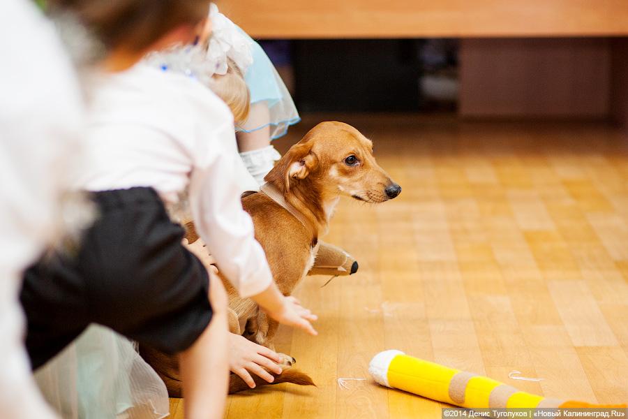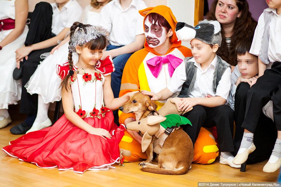 Выступают не только дети: в зал входит аниматор в костюме, и с ним — настоящая живая такса, у которой вдобавок к одной, настоящей, голове появились ещё две — плюшевых. На собачьей спине топорщатся маленькие зелёные крылышки. Это такса Апельсин из приюта для бездомных животных «Дом одиноких кошек, которым некуда больше идти» Анны Брылевской. Аниматор в костюме сегодня — сама Анна, которой не впервой поздравлять детишек: накануне она со своими четвероногими воспитанниками посетила детский