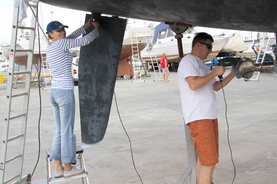 В восемь утра у нас был назначен кран для подъема на берег в ремонтную зону. Мы подошли вовремя и встали на слипе, с которого кран поднимает лодки. Спустя несколько минут подошла еще одна яхта, которой, оказывается, тоже было назначено на восемь. Здорово, что мы успели прийти перед ней. И не только потому, что подъем лодки занимает не меньше часа: лодку выдергивают из воды, сбивают с нее грязь, ракушки и водоросли «Керхером», потом отвозят и ставят на кильблок. У нас все это заняло два часа, а вот следующая лодка загрузила кран часа на четыре.