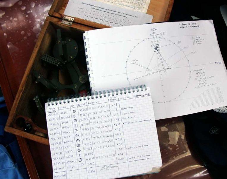 После снятия звезд требуется для каждой обсервации нарисовать линию позиции на карте. По-хорошему, каждую звезду надо успеть снять раза три, чтобы достоверно исключить ошибки, вызванные плохой видимостью и качкой, ошибки записи показаний. Звезд нам надо, по-хорошему, минимум три, чтобы уверенно найти точку пересечения. Итого, работы будет немало — с десяток обсерваций обсчитывать!