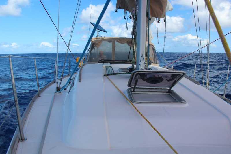 Сегодня в 9 утра опять пришлось дернуть движок на час. Всю ночь дуло 9–13 узлов, но зная коварство темных облаков, блуждавших вокруг нас, спинакер ставить не стали. Поставили на спинакер-гик стаксель, на грот завели завал-таль, и весьма сносно часть ночи ехали бабочкой. Потом ветер усилился до 20 узлов, начался сильный дождь, а ветер скис до 4–5 узлов. В такой ветер на волне мы не едем, а только парусами хлопаем. А им это вредно, они так быстро изнашиваются. В общем, несмотря на антициклон где-то над нами и жаркий ясный день, ночью с погодой не очень повезло. И темнотища во время дождя была. И так ни одной лодки не видно, так еще и звезды затянуло. Зато у меня появилась минутка написать этот пост, пока лодка едет под автопилотом.