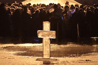 Наконец терпение одного из полицейских лопнуло, и он заорал на очередного стремящегося поглазеть на молитву: «Да куда же ты идёшь? Ты что, не видишь, что сейчас же всё провалится?» Ответ стремившегося к просветлению одновременно шокировал и обескураживал. «Да как же оно провалится, батюшка ведь воду окрестил, оно и не должно провалиться», — сообщил служителю порядка житель Черняховска. «Да я тебя самого сейчас покрещу!» — в бессилии заорал полицейский. Ушёл ли на берег уверовавший в священную силу воды? Не будьте наивными. Трое мужчин взобрались на лестницу, прислонённую к столбу, на котором находился единственный дающий свет прожектор. Наиболее логичным продолжением событий казалось следующее: вначале падает столб, погружая окрестности во тьму, а затем все вышедшие на лёд опускаются под него. К счастью, случилось иначе.