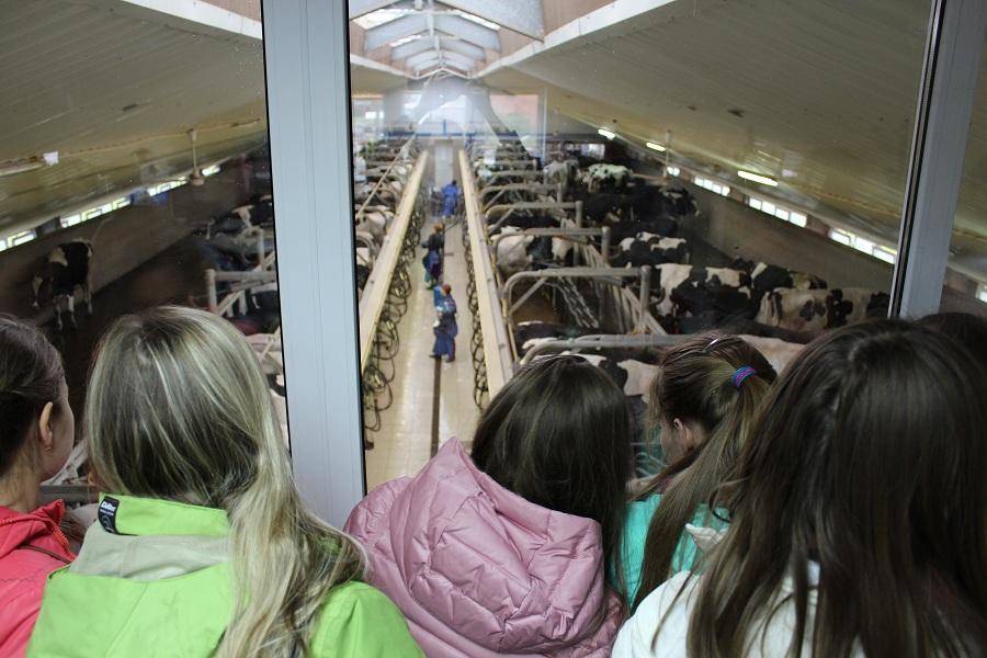 — В современных коровниках компании содержится около 3000 коров, которые свободно гуляют по отведенным для них территории, у каждой коровы есть свой индивидуальный номер и чип, которые присваивается теленку при рождении. Это позволяет получить всю необходимую информацию, в том числе о родословной животного, надое и состоянии здоровья. — Начал свой рассказ он, пригласив школьников на второй этаж здания, откуда открывалась обзорная панорама.