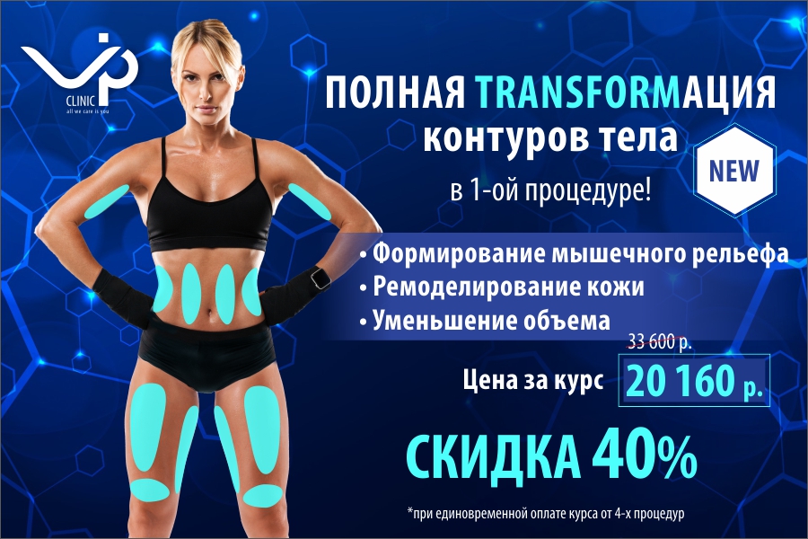Добиться желаемых форм и рельефа в короткие сроки позволит Transform* — новая процедура комплексной коррекции фигуры в «VIP Clinic». До конца февраля при единовременной оплате курса от 4-х процедур действует скидка 40%!