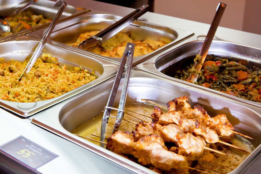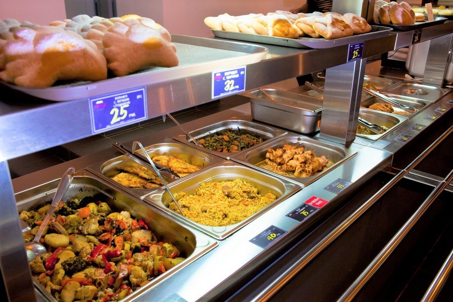 Работает кафе в формате самообслуживания: гости сами могут выбирать салаты, горячие блюда, сделать себе кофе или чай. Обслуживают на кассе очень быстро, работает терминал и есть возможность рассчитаться банковской карточкой.
