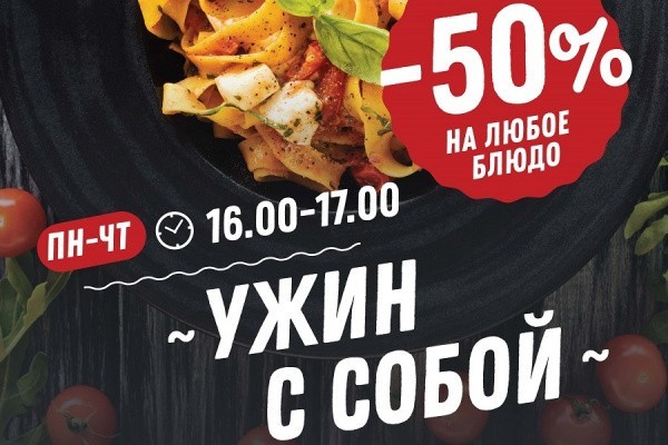 Акция «Ужин с собой» действует с понедельника по четверг с 16.00 до 17.00! Вы можете взять любые блюда со скидкой 50%!