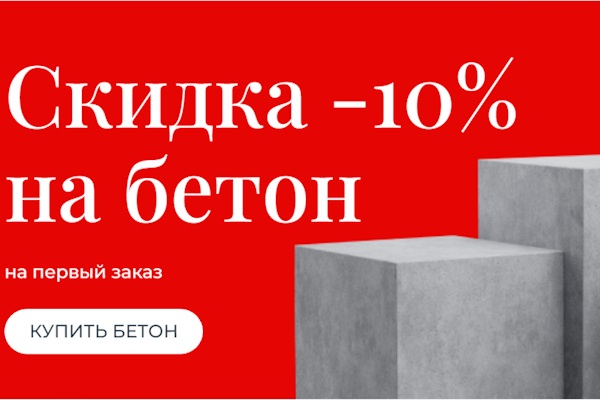 - Совершите первый заказ и получите скидку 10% на всё, включая бетон, доставку и другие услуги.