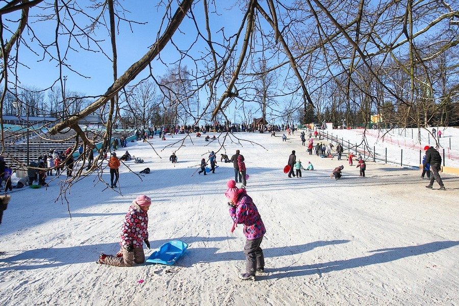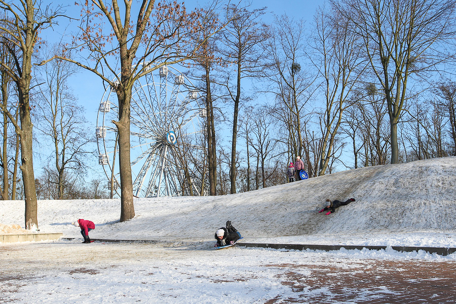 Детвора катается на Нижнем озере, у Дворца творчества детей и молодежи. Скользко — ледянки летят, будь здоров. Мальчишки, разжившиеся пластиковыми корытами, довольны. Горка невысокая и некрутая, но санки едут быстро, и возможность улететь в Нижнее озеро — не иллюзорная. По дороге вниз санки подпрыгивают на бордюре, и чтобы получить фингал, особых усилий прикладывать не придется. Но детворе все нипочем. Горка у бывшего Дома пионеров укатанная, довольно гладкая, ехать можно весело и с ветерком, правда, внизу приходится резко тормозить ногами, чтобы снежные катания не сменить уже на ледовые, или, и того веселее, — на купание — это зависит от толщины льда.