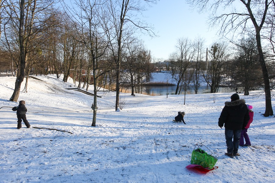 В Макс-Ашманн-парке за озером — высокий холм, который мог бы служить отличным местом для катания. Он им и был. Раньше. Народ катался со всех склонов — и там, где покруче, и там, где безопаснее. Но теперь земля разворочена квадроциклами, на которых тут развлекаются летом. Выпавший снежок в первую же субботу скатали дети, и сейчас ездить тут по ямам — только набивать шишки и царапать санки. Очень жаль, потому что в зимнем парке хорошо, он недалеко от центра, и сам склон для снежных катаний подходящий. На наших глазах мама привела двух дочек с санками. Они залезли на горку, и радость поутихла —