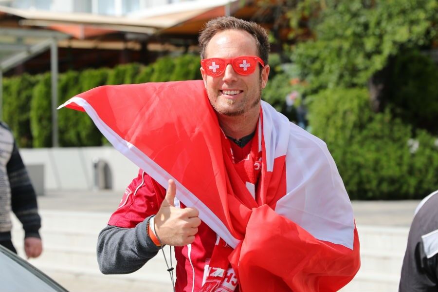 Швейцарские болельщики отмечают победу над сборной Сербии в центре Калининграда. Петь песни они начали уже в шатлах по дороге от стадиона.