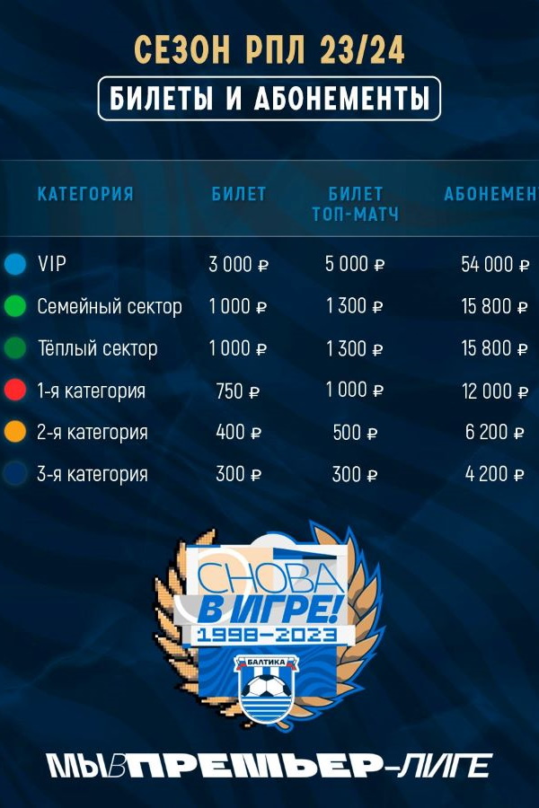 Футбольный клуб «Балтика» повысил цены на билеты и абонементы. Публикация об этом появилась на официальном сайте клуба. Самое значительное повышение коснулось VIP-сектора. Если год назад цена VIP-билета была на уровне 1500 рублей, то теперь она удвоилась. Более того, появилась категория «билет на топ-матч», и место в VIP-ложе на такой игре будет стоить 5000 рублей. Цена абонемента на 18 матчей (в прошлом году — 14 матчей) также выросла с 21 000 рублей до 54 000.
