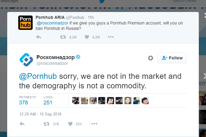 В свою очередь PornHub в «Твиттере» предложил дать Роскомнадзору