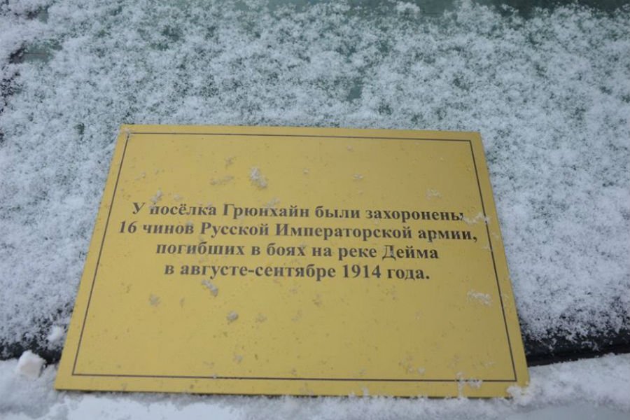 Калининградцы в субботу установили памятную табличку в районе ныне не существующего посёлка Грюнхайн, где в годы Первой мировой войны были похоронены 16 русских воинов. Акцию организовали члены Совета при губернаторе по увековечению памяти погибших защитников Отечества, передает корреспондент «Нового Калининграда.Ru».