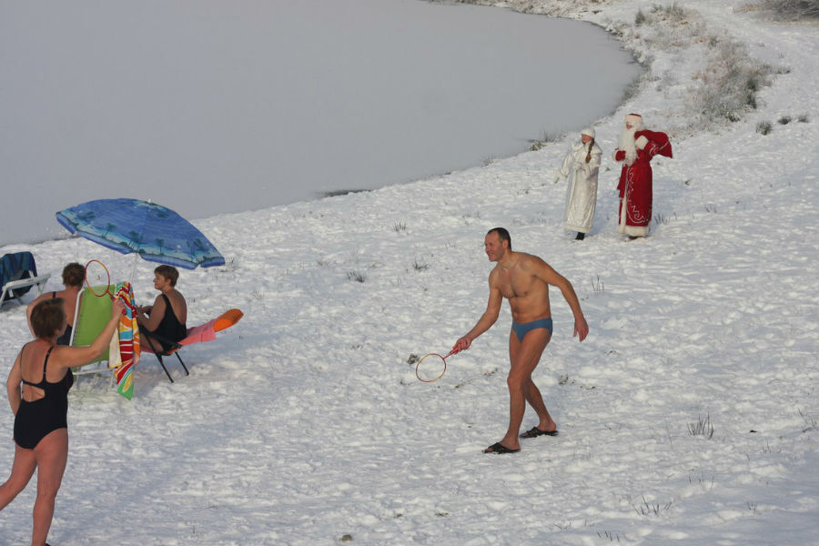 Участники акции купались в воде, играли в бадминтон и «загорали». Большинство из них разделись до нижнего белья, некоторые, впрочем, предпочли остаться в верхней одежде. Во флешмобе также приняли участие Дед Мороз и Снегурочка.