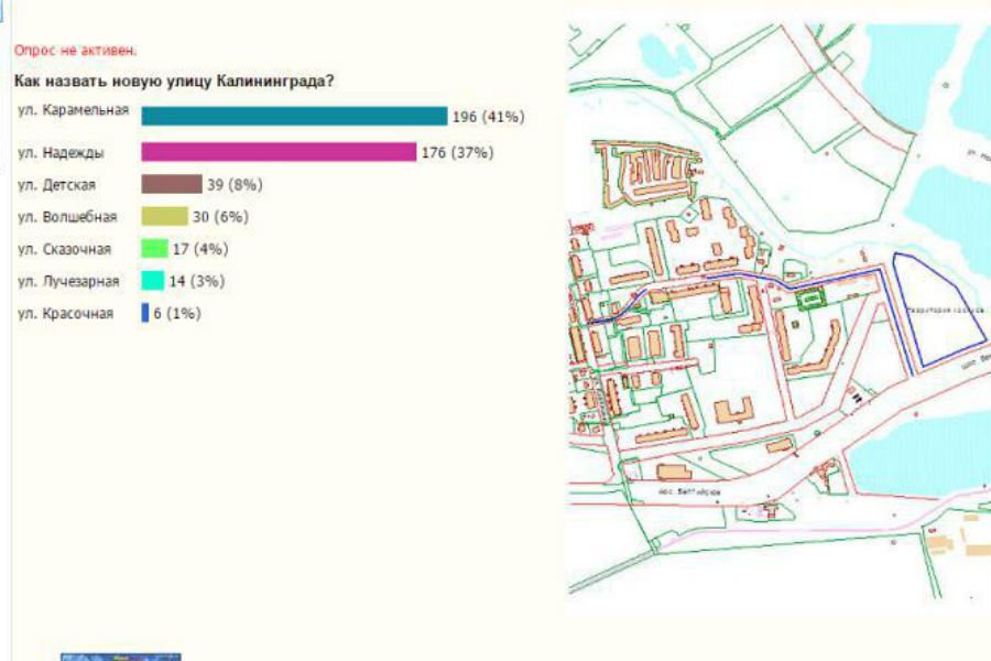 176 человек (37 процентов) отдали свой голос за улицу Надежды. Меньше всего голосов получила улица Красочная — 1 процент. Также жители Калининграда могли проголосовать за улицы Детская, Волшебная, Сказочная и Лучезарная. В