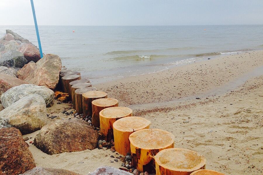 Для укрепления пляжа и защиты от разрушительного волнового воздействия были использованы деревянные сваи из сибирской лиственницы длиной 4 и 6 м. Длина каждой линии бун — 50 м с шагом 50–70 м друг от друга. При выполнении работ были максимально использованы существующие немецкие буны довоенной постройки, к которым привязали уже новые конструкции. Всего для этих целей из Архангельска и других городов России привезено дерева объемом 2466 м³. Стоимость таких работ составила 77,3 млн рублей.